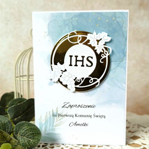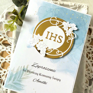 Proste a zarazem eleganckie zaproszenie na komunię z pięknym niebieskim akcentem z dodatkiem złota.
