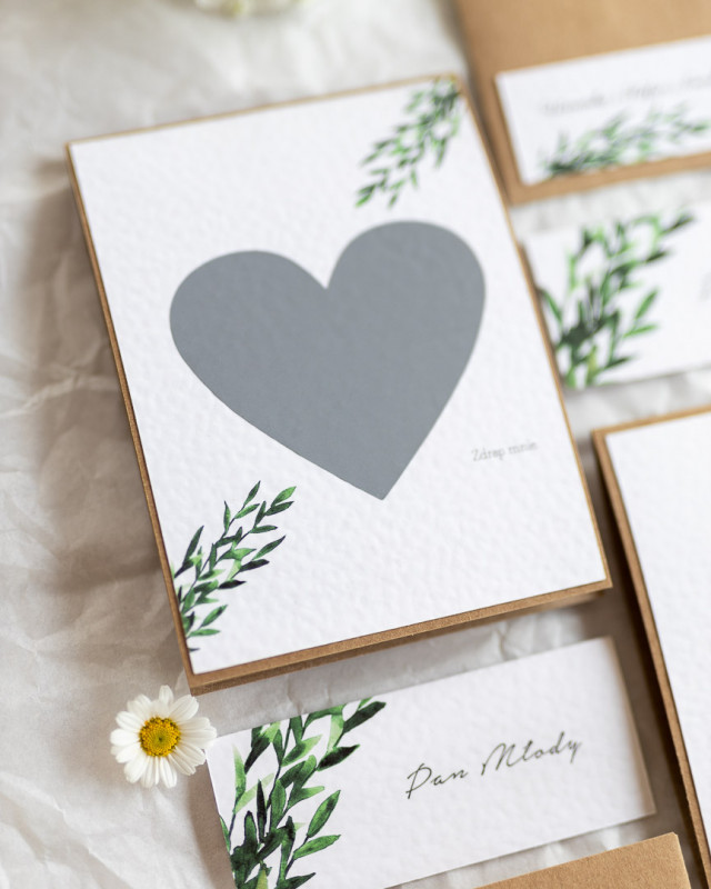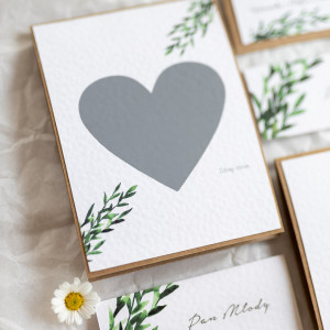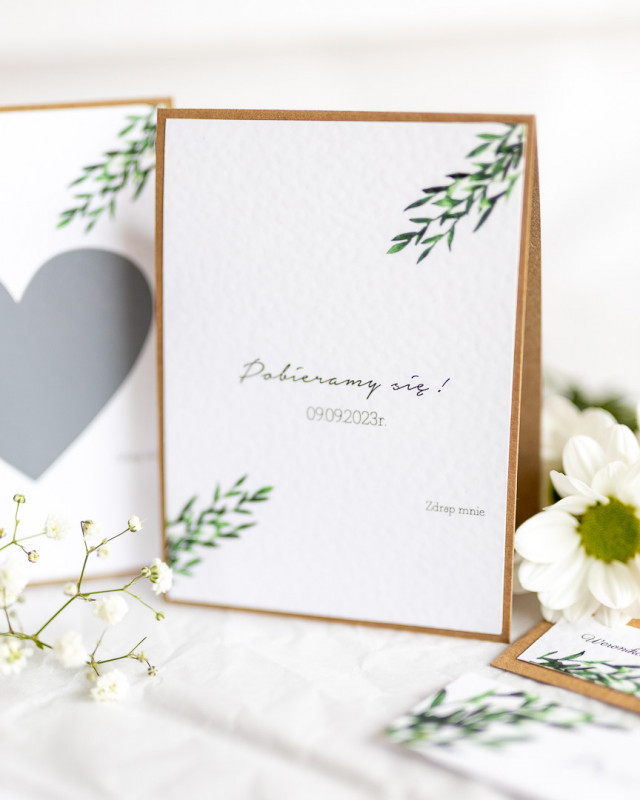 Zdrapka w kształcie serca, a pod nią napis: Pobieramy się i data ślubu