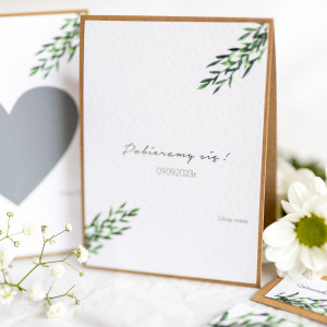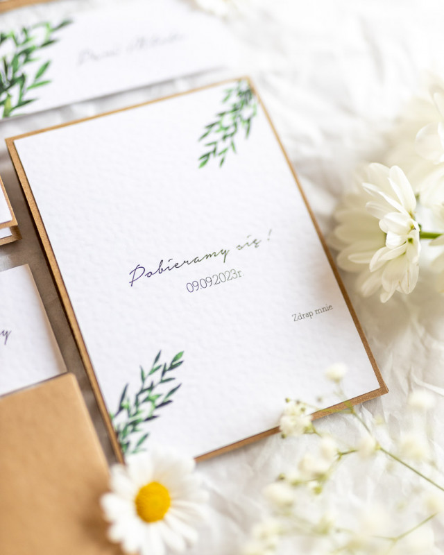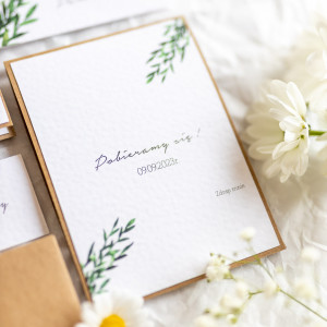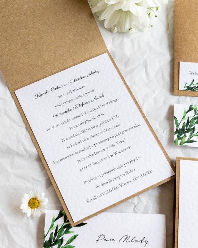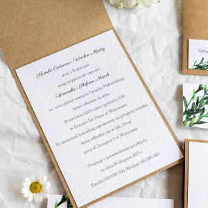 W środku personalizowana treść zaproszenia na białym fakturowanym papierze- możliwe wprowadzenie drobnych zmian w treści.