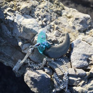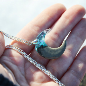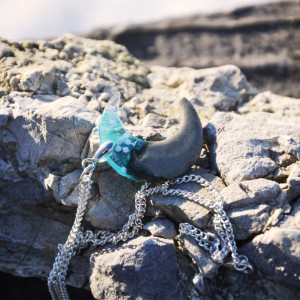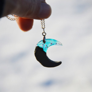 Wisiorek wykonany z żywicy epoksydowej i cementu. Zatopiony zostały w niej błyszczące elementy. Wisiorek zawieszony na srebrnym naszyjniku. Po odlaniu elementy zostały wyszlifowane i wypolerowane. Do ich produkcji została użyta wysokiej jakości żywica, nietoksyczna, odporna na promieniowanie UV. Kolory mogą różnic się w rzeczywistości od zdjęć. ***zapraszam do mojego butiku, znajdziesz w nim wykonane z żywicy i nie tylko przedmioty***
