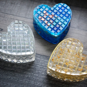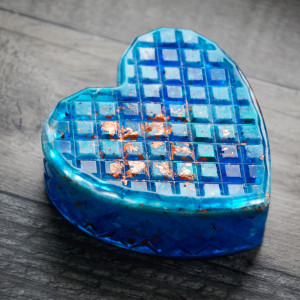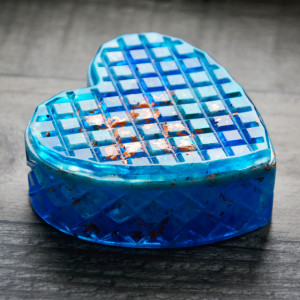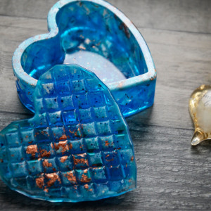 Oryginalna szkatułka, serce wykonana z żywicy. Szkatułka fasetowana połyskuje w świetle różnymi odcieniami błękitów i turkusów. W barwionej żywicy zostały zatopione miedziane płatki.