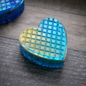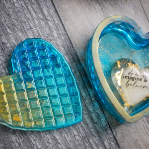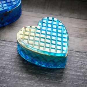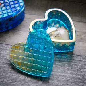 Oryginalna szkatułka, serce wykonana z żywicy. Szkatułka fasetowana połyskuje w świetle różnymi odcieniami błękitów i turkusów oraz złota.
