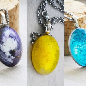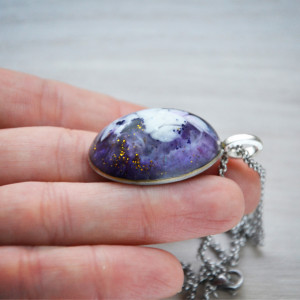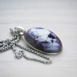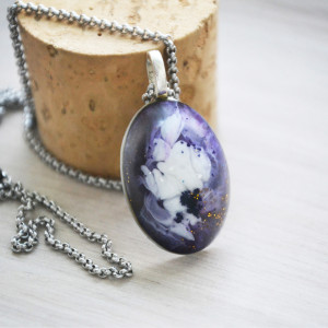 Wisiorek wykonany z żywicy epoksydowej. Żywica została barwiona na różne odcienie fioletu i bieli, wzbogacona o brokat. Bez naszyjnika. Po odlaniu elementy zostały wyszlifowane i wypolerowane.