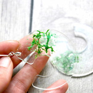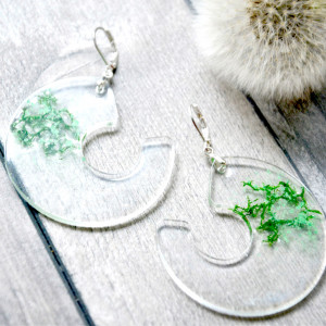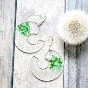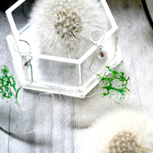 Proste, o wyjątkowym kształcie kolczyki. Zostały wykonane z żywicy. Zatopione w niej zostały kawałeczki porostu chrobotka oraz zielonego brokatu. Zatopiony w ulotnej chwili daje wrażenie zwiewności i lekkości.