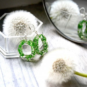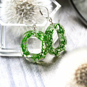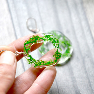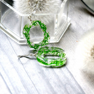 Proste, eleganckie o wyjątkowym kształcie kolczyki. Zostały wykonane z żywicy. Zatopione w niej zostały kawałeczki porostu chrobotka.