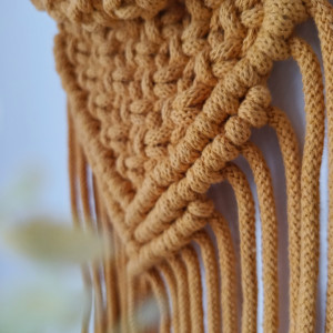 Ta nowoczesna dekoracja ściany to idealny pomysł na ocieplenie wnętrza twojego mieszkania. Makrama w nowoczesnym stylu pasuje do biura, salonu, jako dekoracja w sypialni nad łóżkiem, w jadalni. Pasuje również do dekoracji drzwi wejściowych.