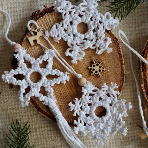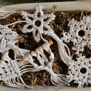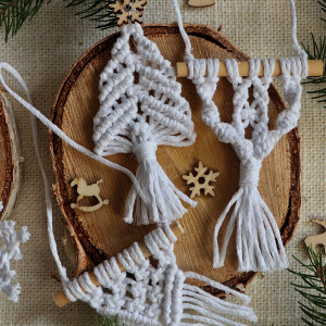 Zawieszki na choinkę wykonane techniką makramy w kolorze białym w stylu boho.