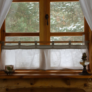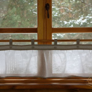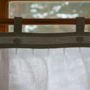 Zazdrostka uszyta jest z pięknej tkaniny lnianej. Listwa i szelki uszyte są z nieprzezroczystej tkaniny w kolorze naturalnym, natomiast dolna część zazdrostki uszyta jest z lekko sztywnej, białej przezroczystej tkaniny, zwanej „lnianą mgłą”. Dół oraz boki zazdrostki wykończone są lamówką z nieprzezroczystej tkaniny w kolorze naturalnym. Listwa zazdrostki ozdobiona jest białą lnianą koronkową wstawką oraz guzikami obciągniętymi tkaniną lnianą w kolorze naturalnym.