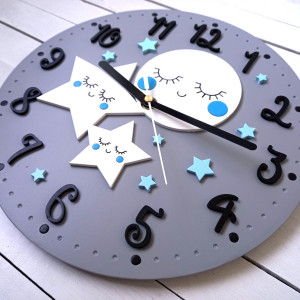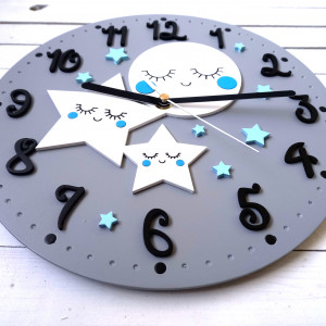 Witam:) Oferuję Państwu uroczy zegar ścienny dla chłopca jak i dla dziewczynki:) Zegar jest wykonywany i malowany przeze mnie ręcznie na zamówienie w co wkładam dużo serca:) Cyfry, gwiazdki oraz księżyc są wycinane i naklejane na tarczę osobno co naprawdę fajnie wygląda. W zegarze dominują stonowane kolory jednakże jestem otwarta na wszelkie zmiany kolorystyczne . Całość utrzymana jest w jasnych kolorach a w połączeniu z szarą tarczą i czarnymi cyferkami wygląda oryginalnie i czytelnie:) Mechanizm w zegarze jest bezgłośny, płynący, a średnica tarczy to 27 cm. Jeżeli mają Państwo pomysł na zegar z własnym motywem - tak aby dopasować go idealnie do wystroju pokoju proszę pisać, razem na pewno stworzymy coś fajnego:) Każdy mój produkt wykonuję na zamówienie.