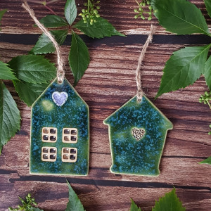 Zestaw ozdób ceramicznych wykonanych ręcznie z jasnej gliny.