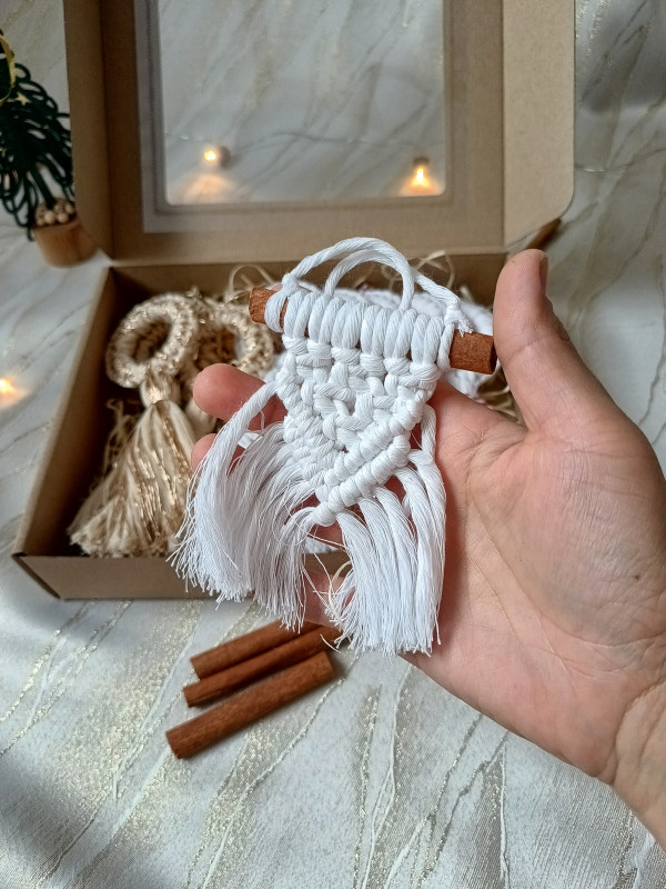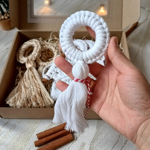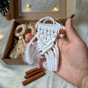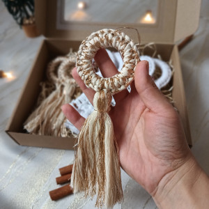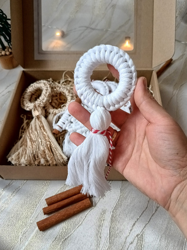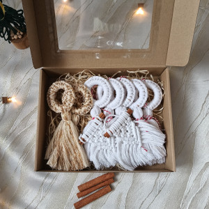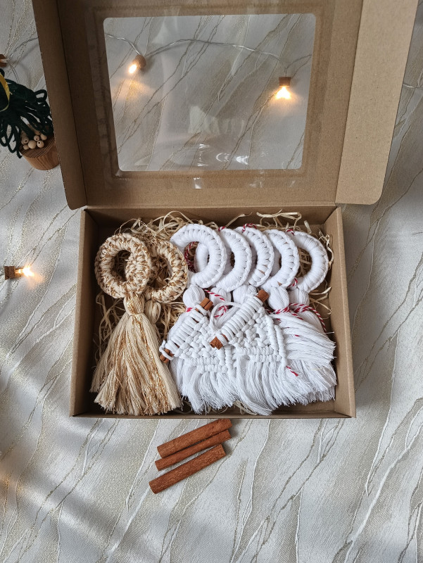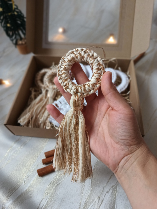 Zestaw zawiera 3 dekoracje na kółku ze złotej nitki, 5 takich samych z białego sznurka oraz dwie zawieszki wykonane na morze cynamonowca, o pięknym zapachuKażda zawieszka posiada już sznureczek, dzięki czemu możesz powiesić ją zarówno na choince, jak i np. na haczyku na oknie, drzwiach
