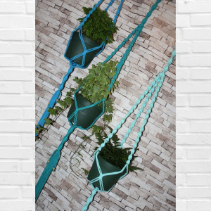 Makramowe, plecione kwietniki do zawieszania, dodadzą uroku każdemu wnętrzu. Wykonane zostały z bawełnianego sznurka z poliestrowym rdzeniem w kolorach- miętowym, szmaragdowym i niebieskim. Do zawieszania służą kółka z surowego drewna. U dołu sznurki są zabezpieczone przy pomocy drewnianych koralików. Doniczki, widoczne na zdjęciu, mają średnicę 16 cm i wysokość 11 cm ( kwiaty i doniczki nie są częścią oferty ).