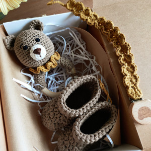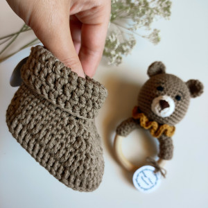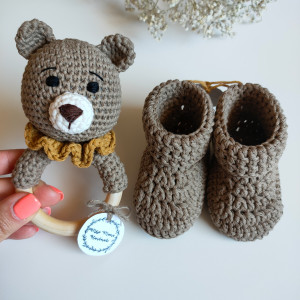 zestaw Miś gryzak grzechotka na szydełku + buciki