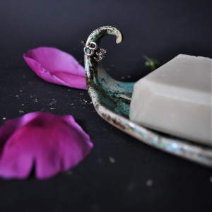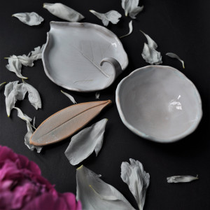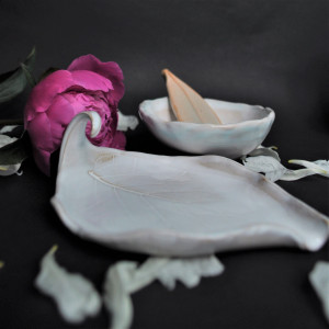 Ceramiczny zestaw rękodzieło do łazienki 3 częściowy - miska na maseczki / glinkę z listkiem do jej mieszania i rozprowadzania oraz mydelniczka z wymyślnym zawijasem na pierścionki.Piękny zestaw dla kobiet do pielegnacji cery w zaciszu domowym.