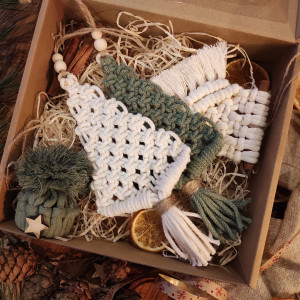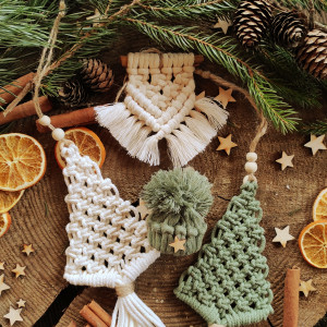 Świąteczne ozdoby wykonane techniką makramy że sznurka bawełnianego z dodatkiem drewnianych korali oraz sznurka jutowego to oryginalna dekoracja w stylu Boho pasująca do każdego wnętrza.