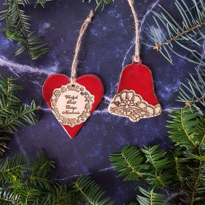 Zestaw ozdób ceramicznych wykonanych ręcznie z jasnej gliny, napisy i elementy koronki zostały przetarte ciemnym szkliwem, reszta w przepięknej czerwieni.