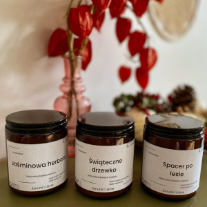Każda z produkowanych przez Nas świec zapachowych wykonana jest z ekologicznego, certyfikowanego wosku sojowego. Wosk sojowy jest w 100% naturalny i ekologiczny – powstaje jako produkt uboczny uprawy soi. Wosk pali się znacznie dłużej niż zwykła parafina i nie szkodzi zdrowiu. Każda tworzona przez nas świeca sojowa jest wykonywana ręcznie. Wosk sojowy topi się dłużej, jego temperatura spalania jest niższa niż parafiny, dlatego świece sojowe mają nawet dwa razy dłuższy czas palenia w porównaniu do świec parafinowych.