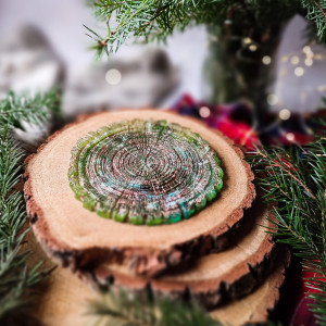 Podkładka pod kubek jest wykonana z żywicy w kształcie plastra drewna, w barwach zieleni w różnych odcieniach i odrobiny miedzi, przyciąga wzrok i sprawia, że aż chce się ją dotknąć, by poczuć nietypową fakturę. Egzemplarze podkładek w zestawach mogą odrobinę różnić się od siebie ze względu na ręczne wykonanie. Podkładki stworzyła dla nas marka Smocze Skarby. By kubek i podkładka służyły jak najdłużej i z szacunku do ręcznej pracy zalecam ręczne mycie.