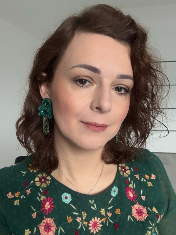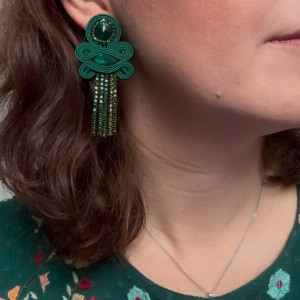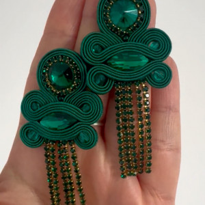 Głęboki kolor butelkowej zieleni doskonale komponuje się z ozdobnymi kryształkami i frędzlami z taśmy cyrkoniowej, nadając im niepowtarzalny charakter.
