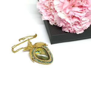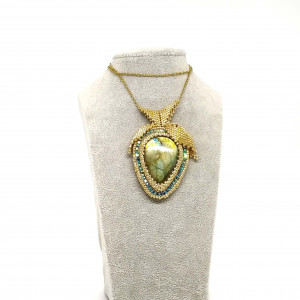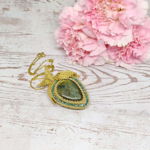 Złociste koraliki oplatają wyjątkowy okaz labradorytu i dodają mu blasku. Pełne fantazji maleńkie kryształki i koralikowe listki dodają mu powabu. Wisior wykończonyskórką i zawieszony na łańcuszku ze stali chirurgicznej.