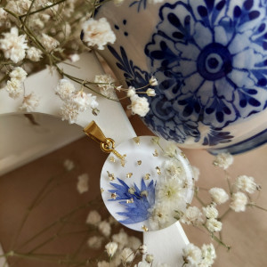Oferuję Państwu unikalną biżuterię. Zawieszka jest wykonana z suszonych kwiatów i żywicy epoksydowej. Biżuteria jest wspaniałym i oryginalnym prezentem na lata. Do utrwalenia roślin stosuję żywicę jubilerską najwyższej jakości.