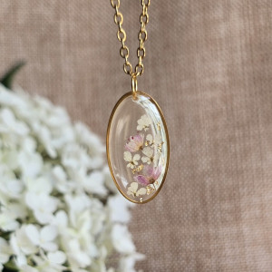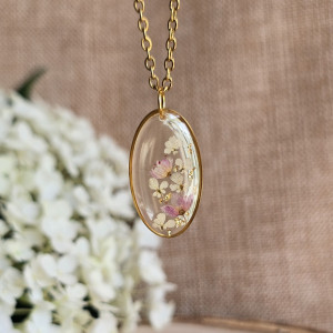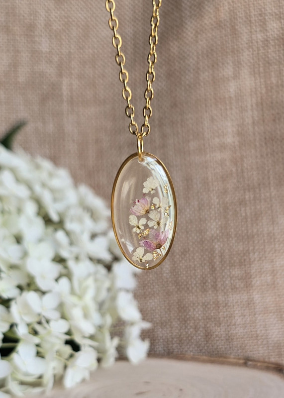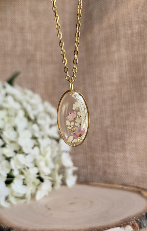 Oferuję Państwu unikalną biżuterię. Zawieszka jest wykonana z suszonych kwiatów i żywicy epoksydowej. Biżuteria jest wspaniałym i oryginalnym prezentem na lata. Do utrwalenia roślin stosuję żywicę jubilerską najwyższej jakości.