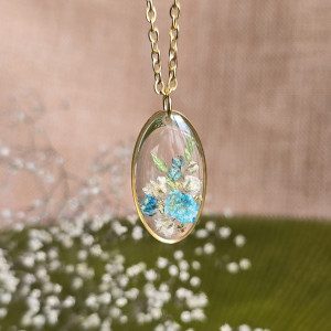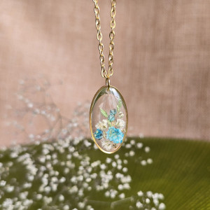 Oferuję Państwu unikalną biżuterię. Zawieszka jest wykonana z suszonych kwiatów i żywicy epoksydowej. Biżuteria jest wspaniałym i oryginalnym prezentem na lata. Do utrwalenia roślin stosuję żywicę jubilerską najwyższej jakości.