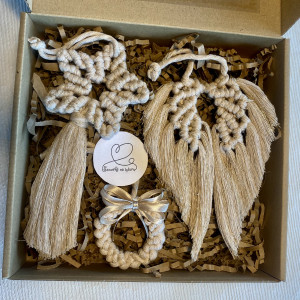 Zestaw zawiera 3 zawieszki wyplecione ze sznurka bawełnianego przeplatanego złotą nitką - gwiazda, skrzydła i mini wieniec.