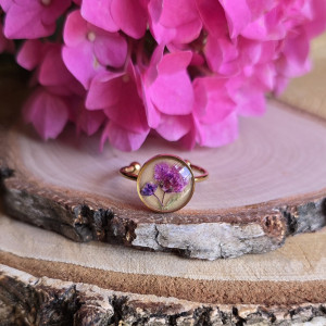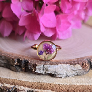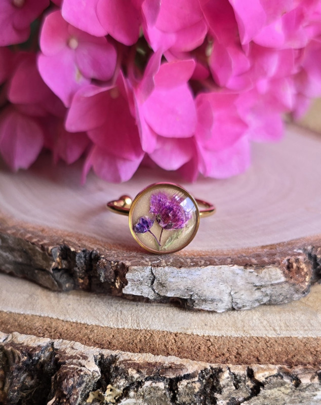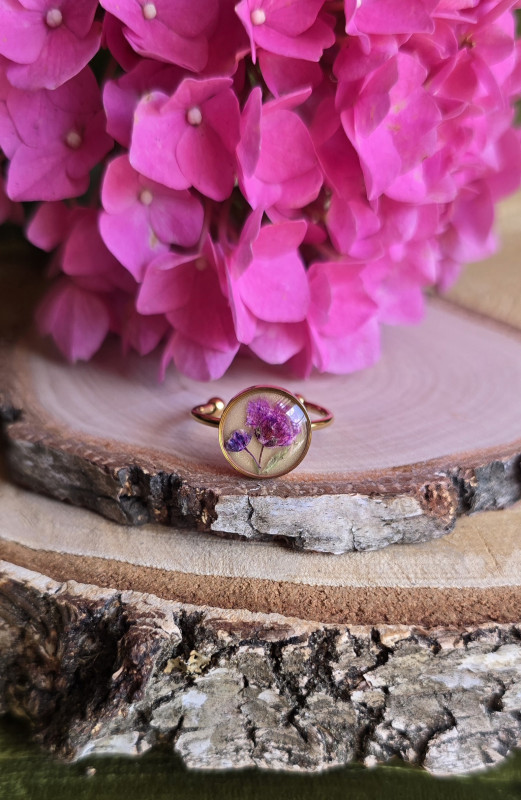 Oferuję Państwu unikalną biżuterię. Pierścionek jest wykonany z suszonych kwiatów i żywicy epoksydowej. Biżuteria jest wspaniałym i oryginalnym prezentem na lata.