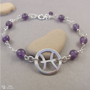 Delikatna bransoletka z kolekcji „Znaki zodiaku” ze srebrnym, ręcznie wyciętym symbolem RYB, otoczonym 6mm kulkami naturalnego ametystu. Bransoletka ma długość regulowaną 19,5-22cm, srebrna blaszka ma 1,7cm średnicy.