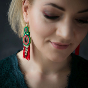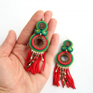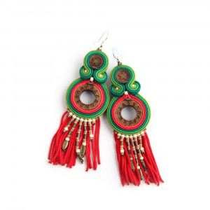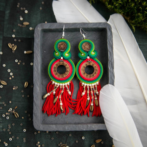 Barwne, oryginalne, ręcznie haftowane kolczyki w stylu etnicznym. Ich kolorystyka to odcienie zieleni i czerwieni, z brązem. Elementy wycięte z drewna orzecha są oprawione haftem sutaszowym. Miękkie oraz koralikowe frędzelki u dołu sprawiają, że kolczyki przypominają łapacze snów. Kolczyki są bardzo lekkie i wygodne, ich długość to ok. 11 cm. Bigle mają ze srebra 925.