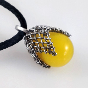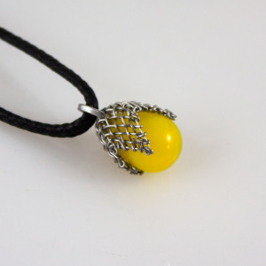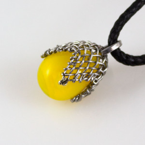 Szklana kropla oprawiona w ręcznie formowaną metalową siateczkę. Całkowita wielkość wisiorka to ok. 2 cm. W komplecie bawełniany sznurek do zawieszenia.