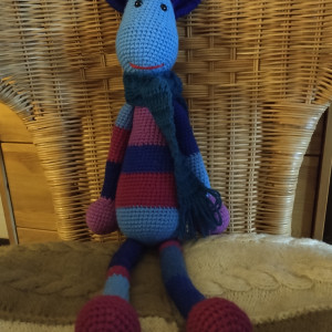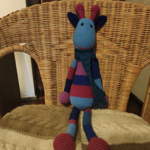 Żyrafa wykonana została na szydełku z kolorowych włóczek akrylowych. Wokół szyi ma zawiązany szydełkowy szalik. Wypełnienie antyalergiczne kulką silikonową. Można prać.